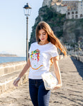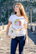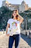 La t-shirt è stata realizzata su un disegno dipinto a mano e poi stampato.